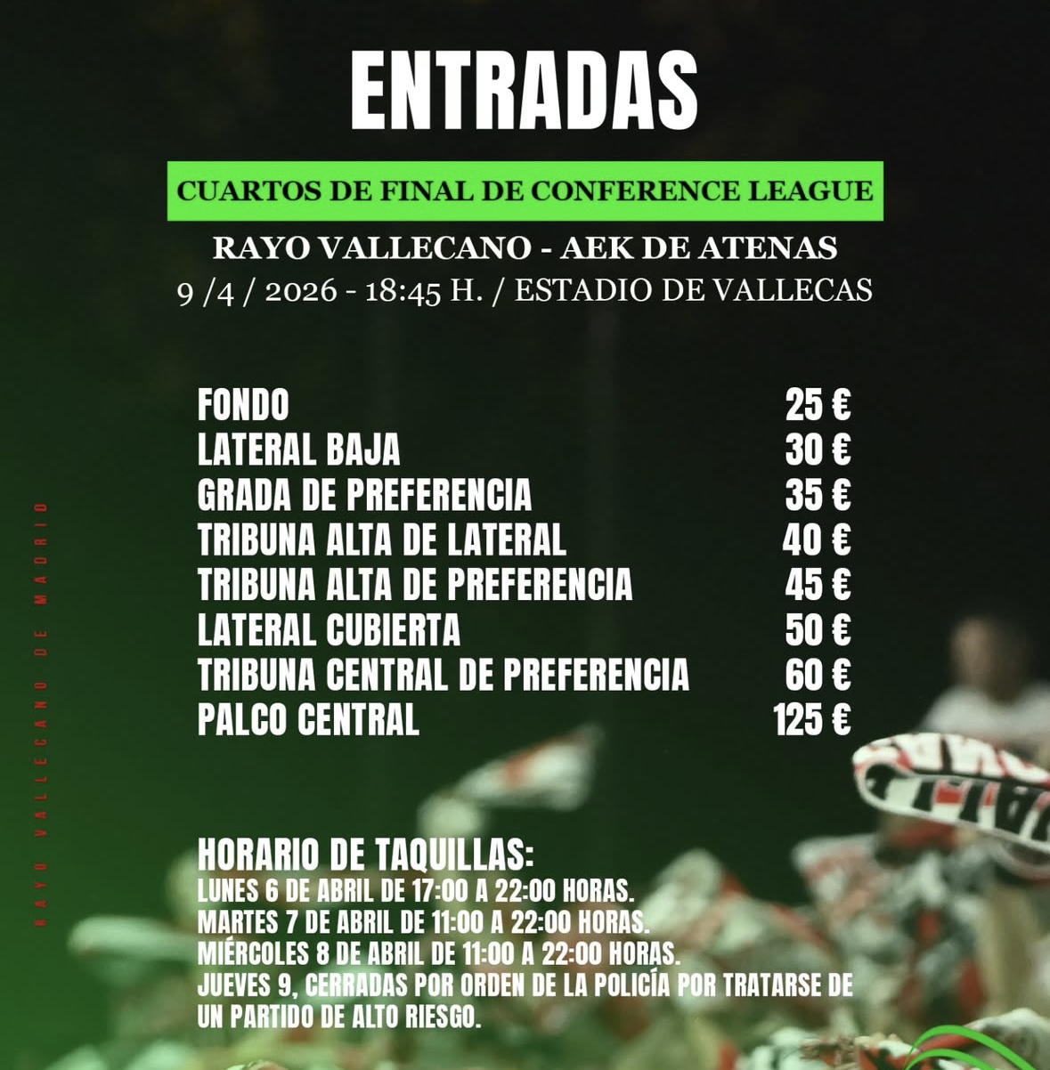 Miles de aficionados del Rayo Vallecano se congregan alrededor del Estadio de Vallecas para intentar adquirir sus entradas para el encuentro contra el AEK de Atenas del jueves 9 de abril. El encuentro se disputará en el Estadio de Vallecas a las 18:45. Ambos equipos se enfrentarán en la primera ronda de los cuartos de final de la Conference League.
