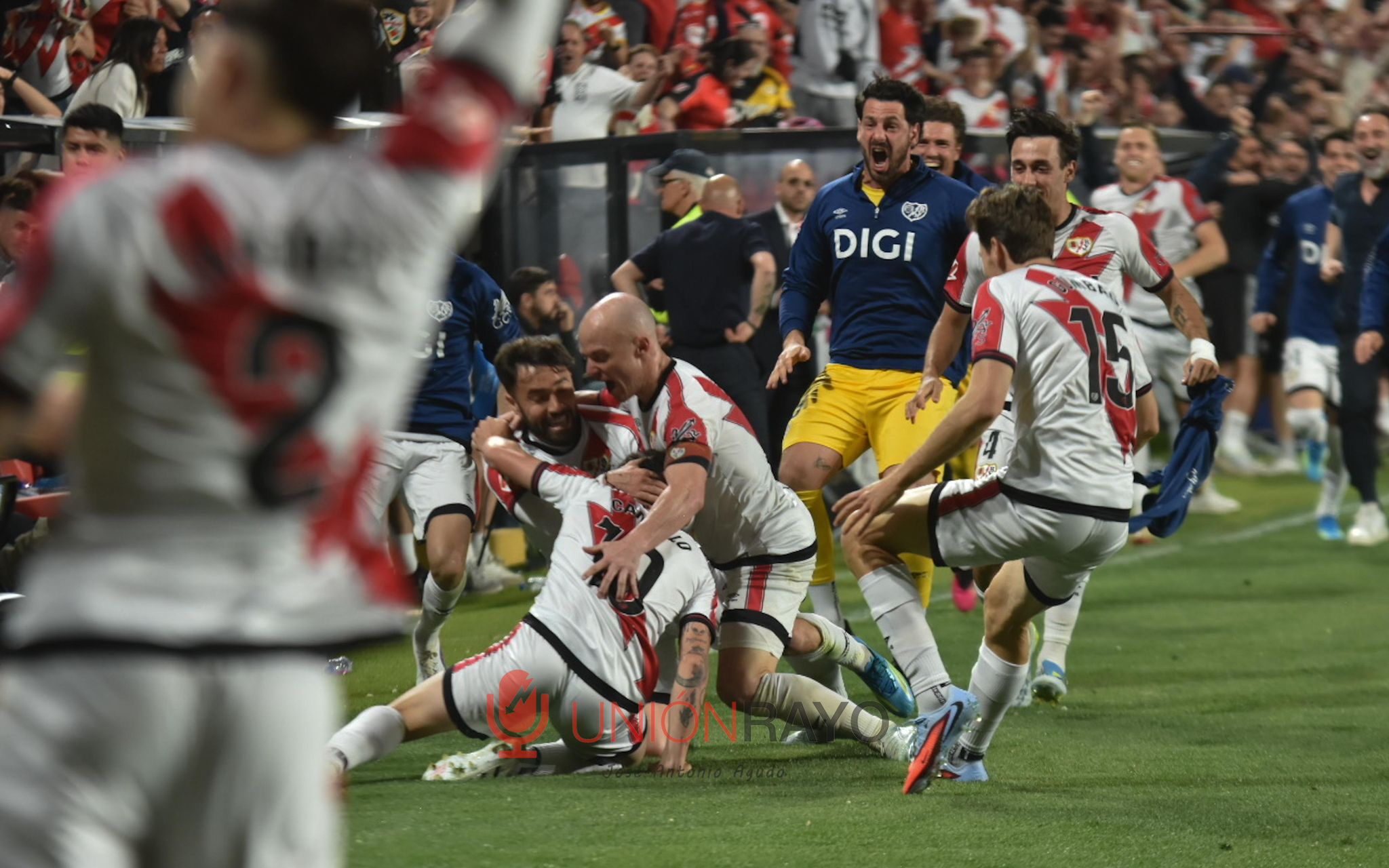 La afición del Rayo Vallecano y la plantilla rayista celebraron juntos en Vallecas un triunfo de esta temporada en LaLiga frente al Espanyol (1-0), correspondiente a la 33ª jornada del campeonato liguero. Un partido que se disputó este jueves 23 de abril a las 20:00 horas, pero que finalizó con La Vida Pirata como es costumbre en el feudo franjirrojo con cada triunfo.