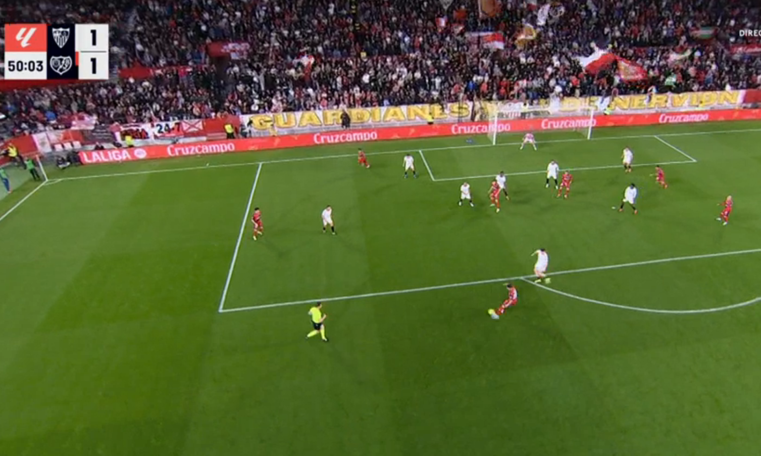El lateral zurdo cogió de primeras un pase de Fran Pérez y su disparo cogió una parábola imparable para el portero del conjunto hispalense, Odisseas Vlachodimos.