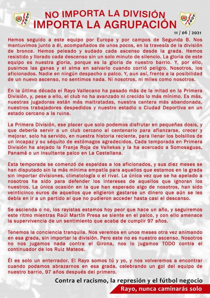 Bajo el lema «No importa la división, importa la Agrupación», la Peña ha querido repasar su apoyo a la institución de 97 años, dejando clara su postura contra el Presidente del Club: «se ascienda o no, los rayistas estamos hoy peor que hace un año, y seguiremos ese ritmo mientras Martín Presa se siente en el palco».
