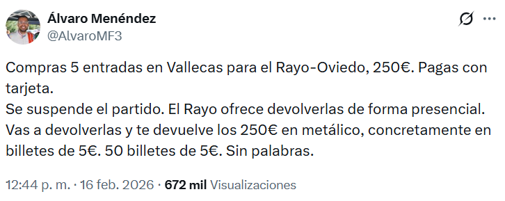 La semana pasada el Rayo Vallecano emitía un comunicado donde se hace responsable de las entradas vendidas para el duelo ante el Real Oviedo en el cual explicaban los diferentes métodos de la devolución, de manera presencial como online. Ha sido en el primer caso, donde se ha producido una de las anécdotas más sorprendentes. Un aficionado del Oviedo ha afirmado que: «Compras 5 entradas en Vallecas para el Rayo-Oviedo, 250€. Pagas con tarjeta. Se suspende el partido. El Rayo ofrece devolverlas de forma presencial. Vas a devolverlas y te devuelve los 250€ en metálico, concretamente en billetes de 5€. 50 billetes de 5€. Sin palabras».