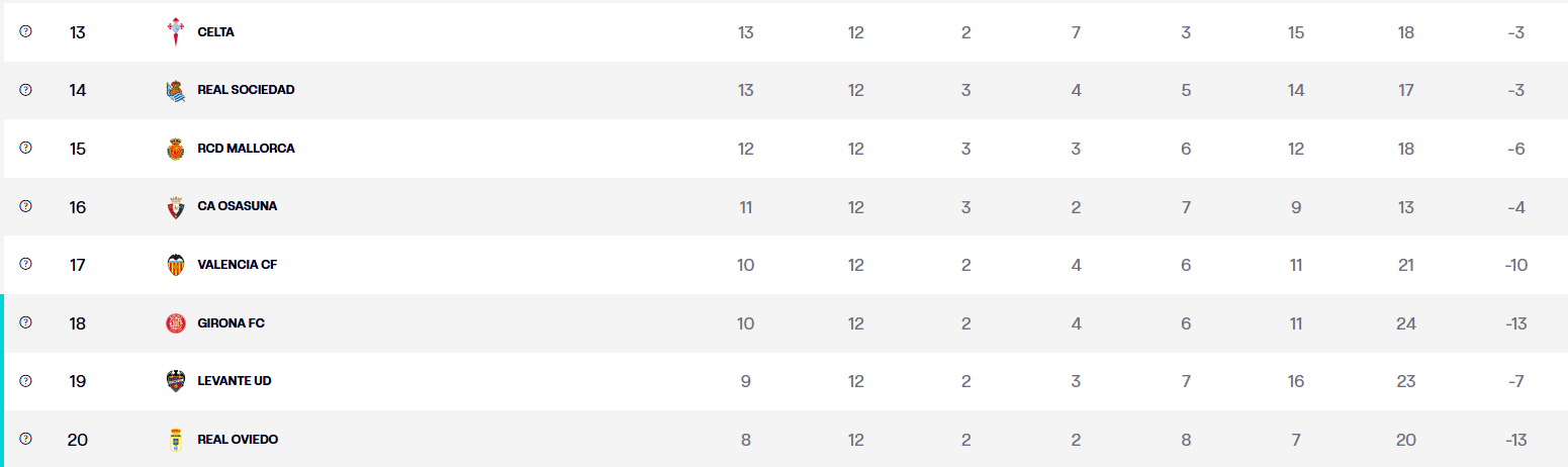 Clasificación de LaLiga 25/26. LALIGAEl Oviedo llega tras perder 1-0 contra el Athletic a domicilio el pasado domingo, 9 de noviembre, con un solitario gol de Nico Williams. Actualmente, los carbayones son colistas de LaLiga EA Sports con ocho puntos, situándose a dos puntos de los puestos de permanencia que marca el Valencia. La urgencia por sumar puntos en casa será clave en este choque.