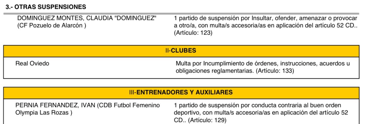 La Real Federación Española de Fútbol no ha recogido ninguna sanción tras el acta realizada por la colegida del partido que enfrentó al Rayo Vallecano Femenino ante el CF Pozuelo de Alarcón, correspondiente a la primera ronda de la Copa de la Reina, disputado en el Campo 4 de la Ciudad Deportiva.