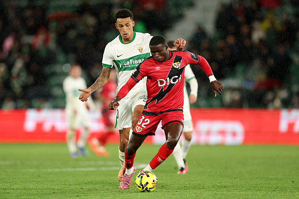 ELCHE, SPAIN - DECEMBER 21: Nobel Mendy of Rayo Vallecano runs with the ball whilst under pressure from Alvaro Rodriguez of Elche CF during the LaLiga EA Sports match between Elche CF and Rayo Vallecano de Madrid at Estadio Manuel Martinez Valero on December 21, 2025 in Elche, Spain. (Photo by Clive Brunskill/Getty Images) Jornada 17 de LaLiga, partido entre el Elche y el Rayo Vallecano